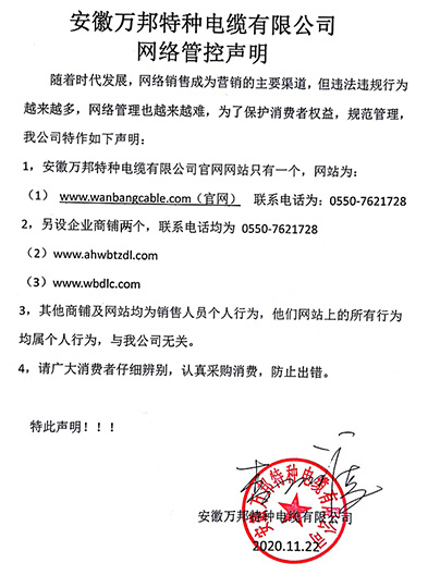 鄭重聲明:安徽萬邦特種電纜有限公司官方網站為:www_wanbangcable_com.szbhrzzz.cn,除此之外無任何子網站或合作網站,其余均為假冒偽劣。電話:0550-7621728 13485756353 地 址:安徽省天長市滁州高新技術產業開發區經四路29號